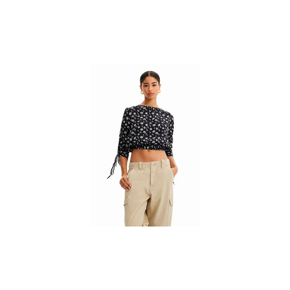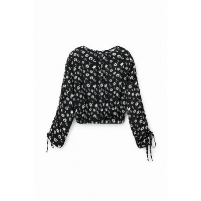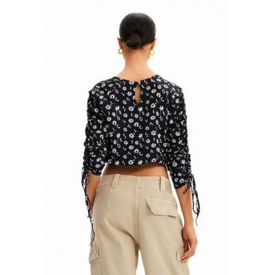 Blouse courte à manches longues à fronces réglables élastiquées aux poignets et ouverture dans le dos, agrémentée d'un imprimé floral.
