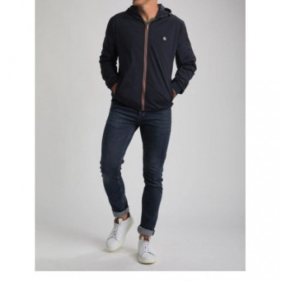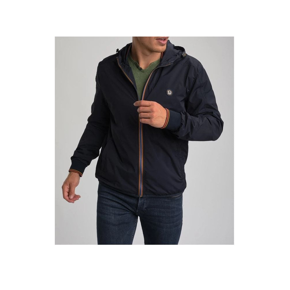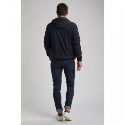 Veste légère en microfibre avec capuche à emporter partout avec soi. La capuche dispose d'un lien de serrage pour plus de protection, le col et les poignets sont agrémentés d'un bord-côte avec des rayures colorées en rappel sur de la fermeture à glissière et sur l'intérieur des poches latérales.