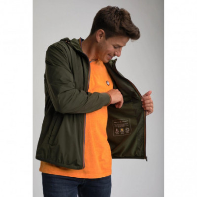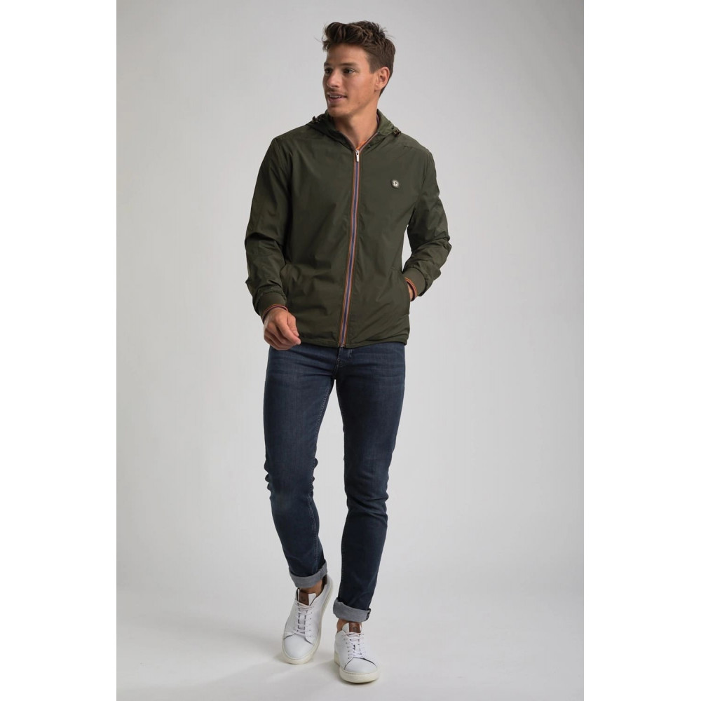 Veste légère en microfibre avec capuche à emporter partout avec soi. La capuche dispose d'un lien de serrage pour plus de protection, le col et les poignets sont agrémentés d'un bord-côte avec des rayures colorées en rappel sur de la fermeture à glissière et sur l'intérieur des poches latérales.