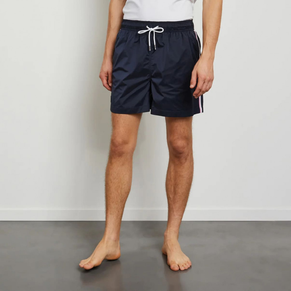 Ce short de bain uni est réhaussé par une bande tricolore de chaque côté. La taille est élastiquée et possède un cordon de serrage pour s'ajuster au mieux à votre morphologie. Il est équipé de poches latérales, d'une poche velcro à rabat sur l'arrière et d'une doublure en mesh