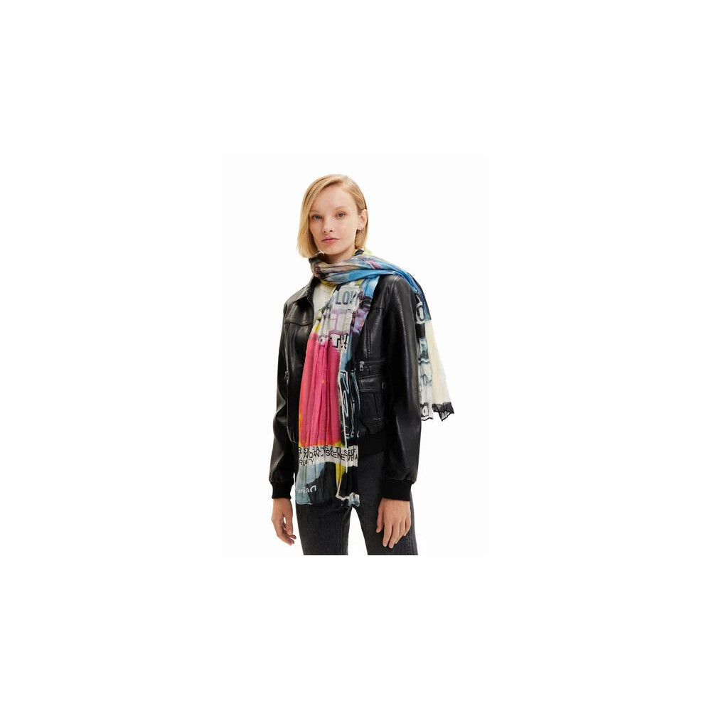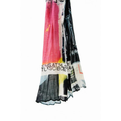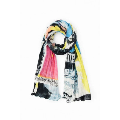 Foulard rectangulaire en tissu à la texture froissée, agrémenté d'un imprimé journal.