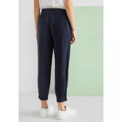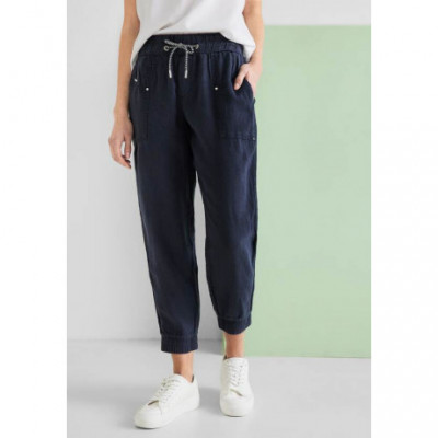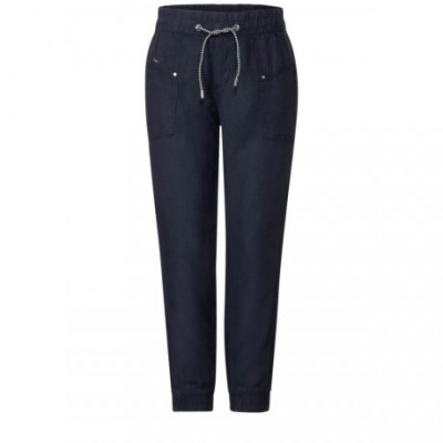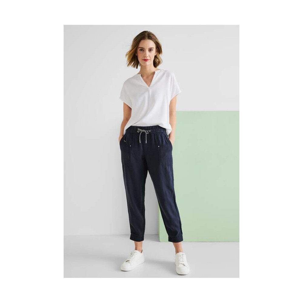Cap sur l'été ! Ce pantalon femmes dans le style Bonny de Street One est particulièrement agréable à porter lorsqu'il fait chaud avec sa matière en lin légère. Dans un style cargo décontracté avec des poches en biais et des bas de jambes élastiqués, il montre son côté cool. La coupe ample, ainsi que la taille élastique mi-haute à cordon coulissant améliore encore le confort.