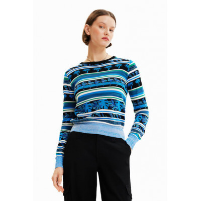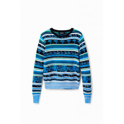 Pull à manches longues en maille à rayures, agrémenté de frises à motifs tropicaux.