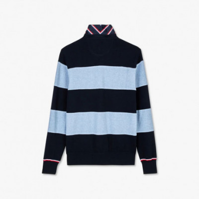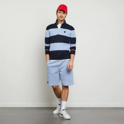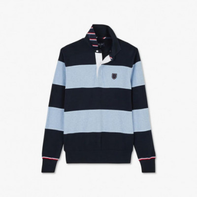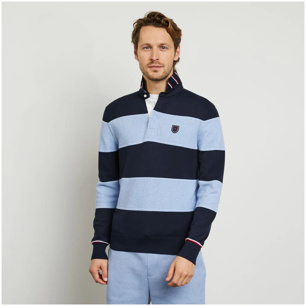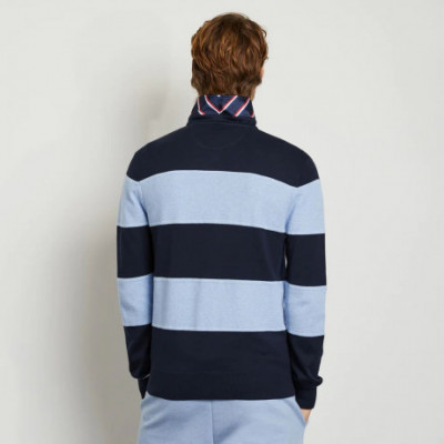 Ce pull à rayures affiche un joli mélange de maille jersey et de maille piquée ainsi qu'un col polo en twill à revers en tissu cravate. Il possède une ouverture partiellement boutonnée et un badge en silicone logo noeud papillon sur la poitrine