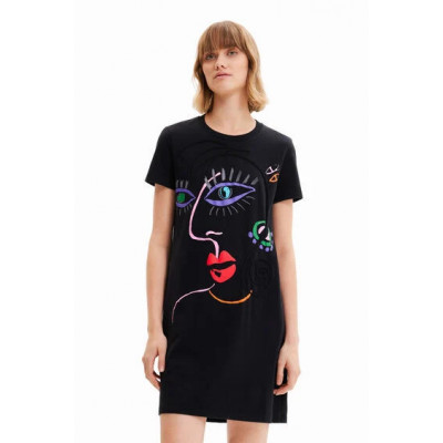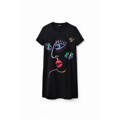 Robe courte et ample de style t-shirt à manches courtes, agrémentée d'un imprimé visage arty sur le devant.