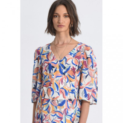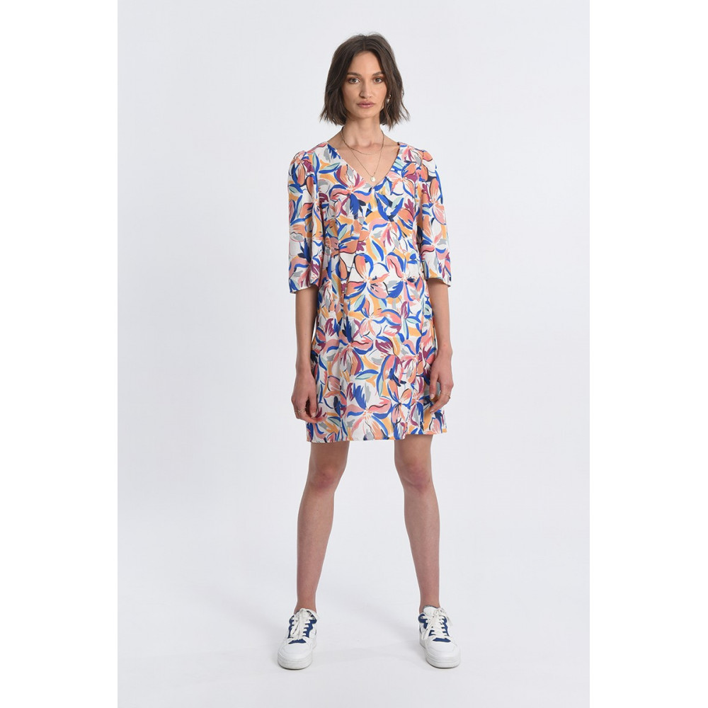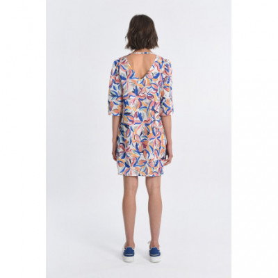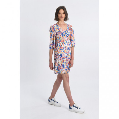 Robe en imprimé coloré légèrement évasée, féminine par son encolure V devant et dos et ses manches 3/4. Longueur : 90cm Taille S
