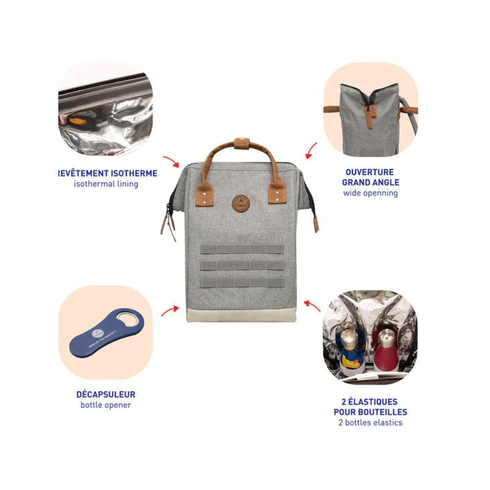 Sac à dos Vegan et garanti à vie avec revêtement isotherme, ouverture grand angle, décapsuleur inclus, 2 élastiques pour bouteilles, bande d'attache pour valise, bretelles molletonnées et anti-transpirantes, fond étanche nettoyable facilement, et plein d'autres fonctionnalités ingénieuses !