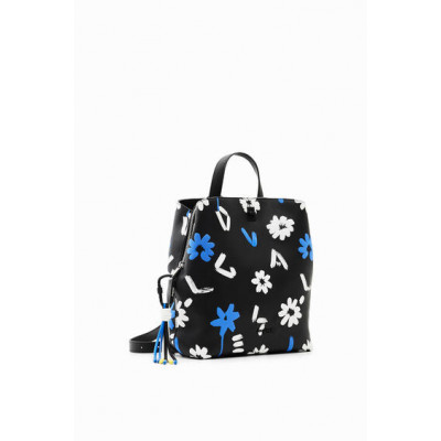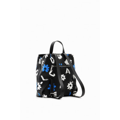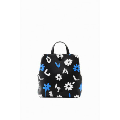 Petit sac à dos en tissu effet cuir agrémenté d'un imprimé de fleurs et de lettres en relief, doté de plusieurs anses, compartiments et poches.