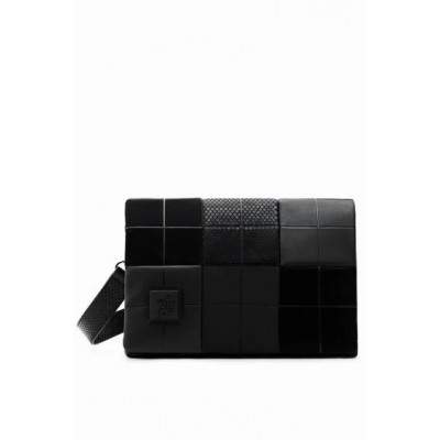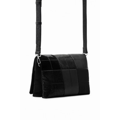 Sac à bandoulière moyen confectionné dans un patchwork de matières différentes, doté d'un rabat et de plusieurs compartiments et poches.