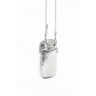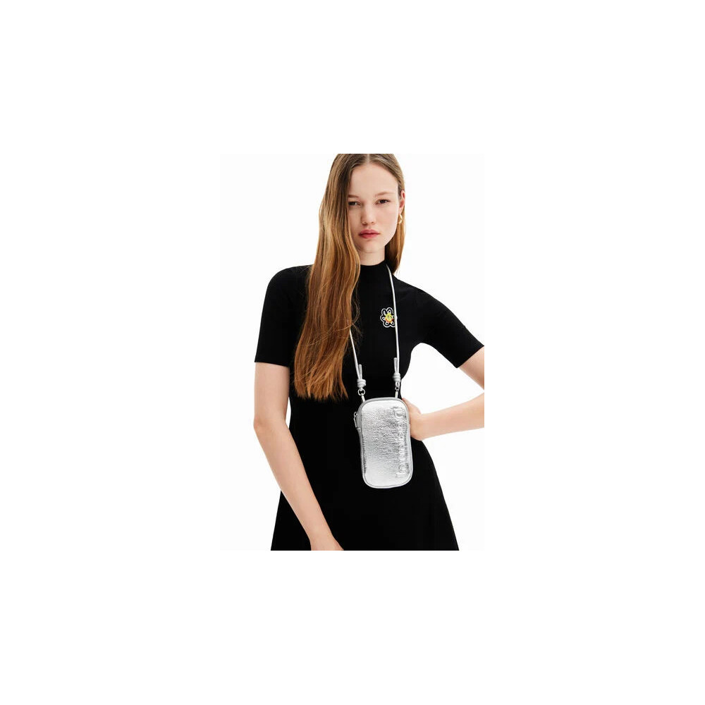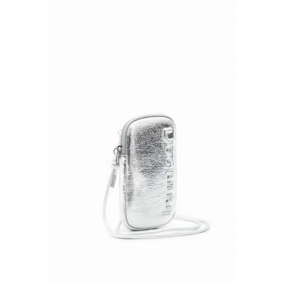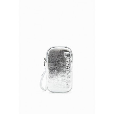 Étui de téléphone portable en tissu effet cuir avec logo en relief, doté d'une fermeture Éclair et de plusieurs poches.