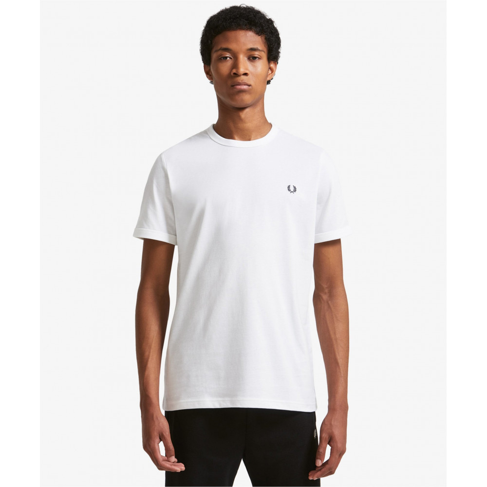 Le t-shirt Fred Perry ringer t-shirt est destiné à rafraîchir vos essentiels décontractés. Fabriqué dans un jersey de coton très doux, ce simple t-shirt blanc présente un col et des poignets côtelés à anneaux, tandis que la couronne de laurier noire brodée sur la poitrine apporte une touche finale iconique. Cette saison, associez votre t-shirt Fred Perry à un denim fin et à des baskets de luxe.
